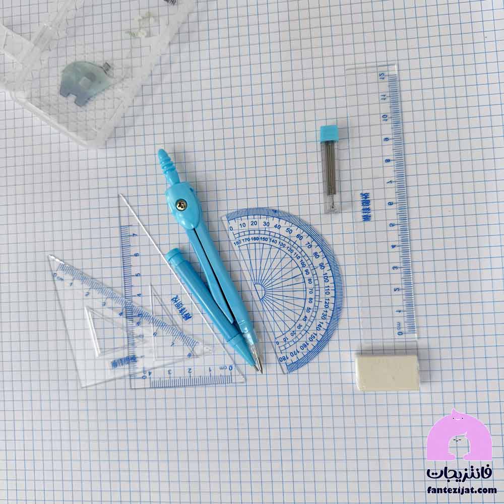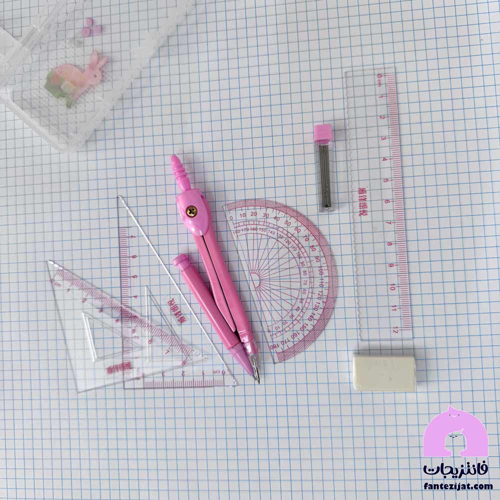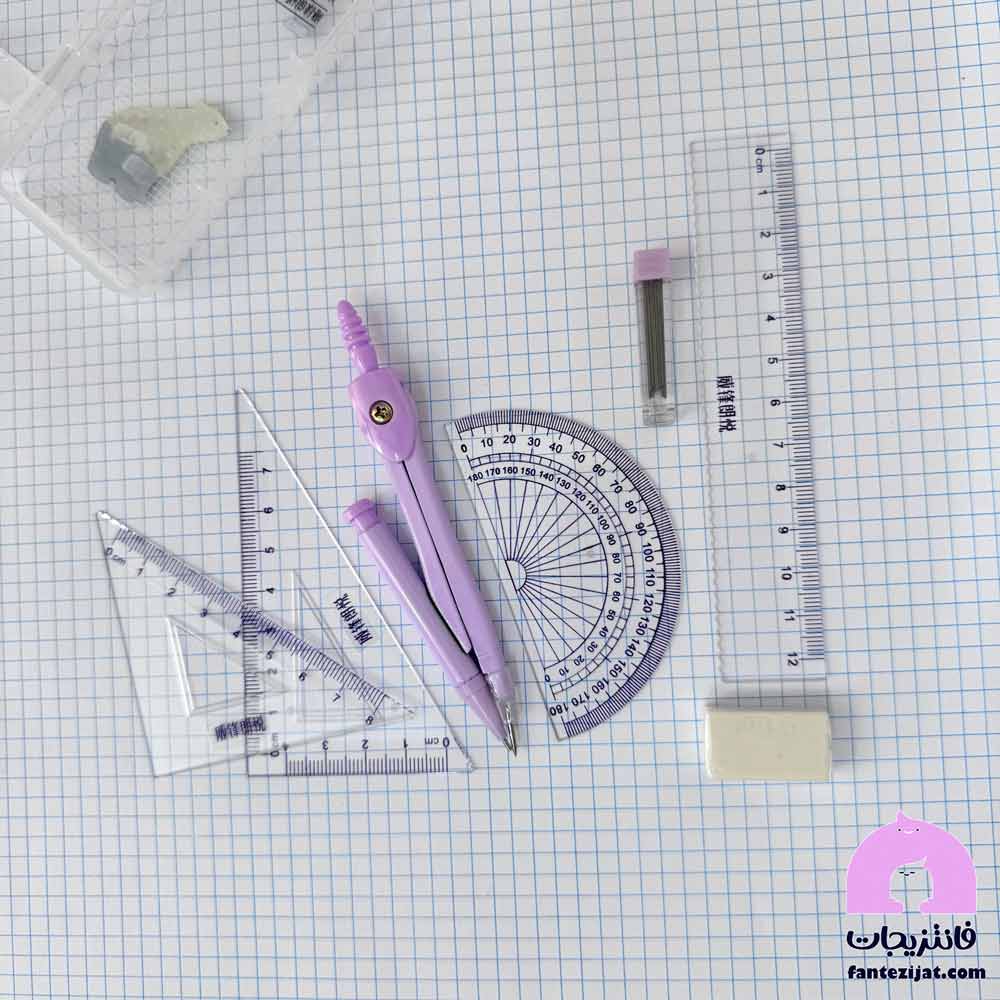 محتویات پک: نقاله، دو عدد گونیا، پرگار اتودی، خطکش 12 سانتی، مغز اتود و یک عدد پاک کن.