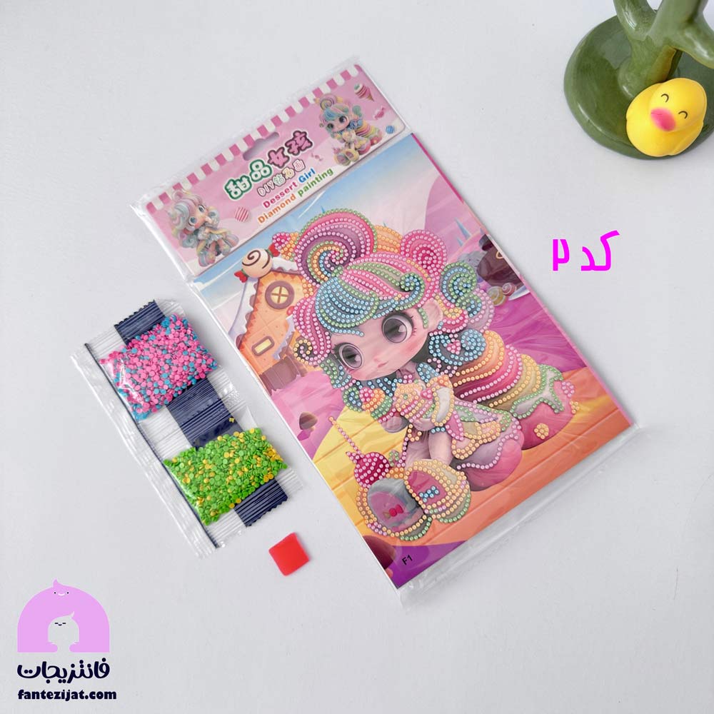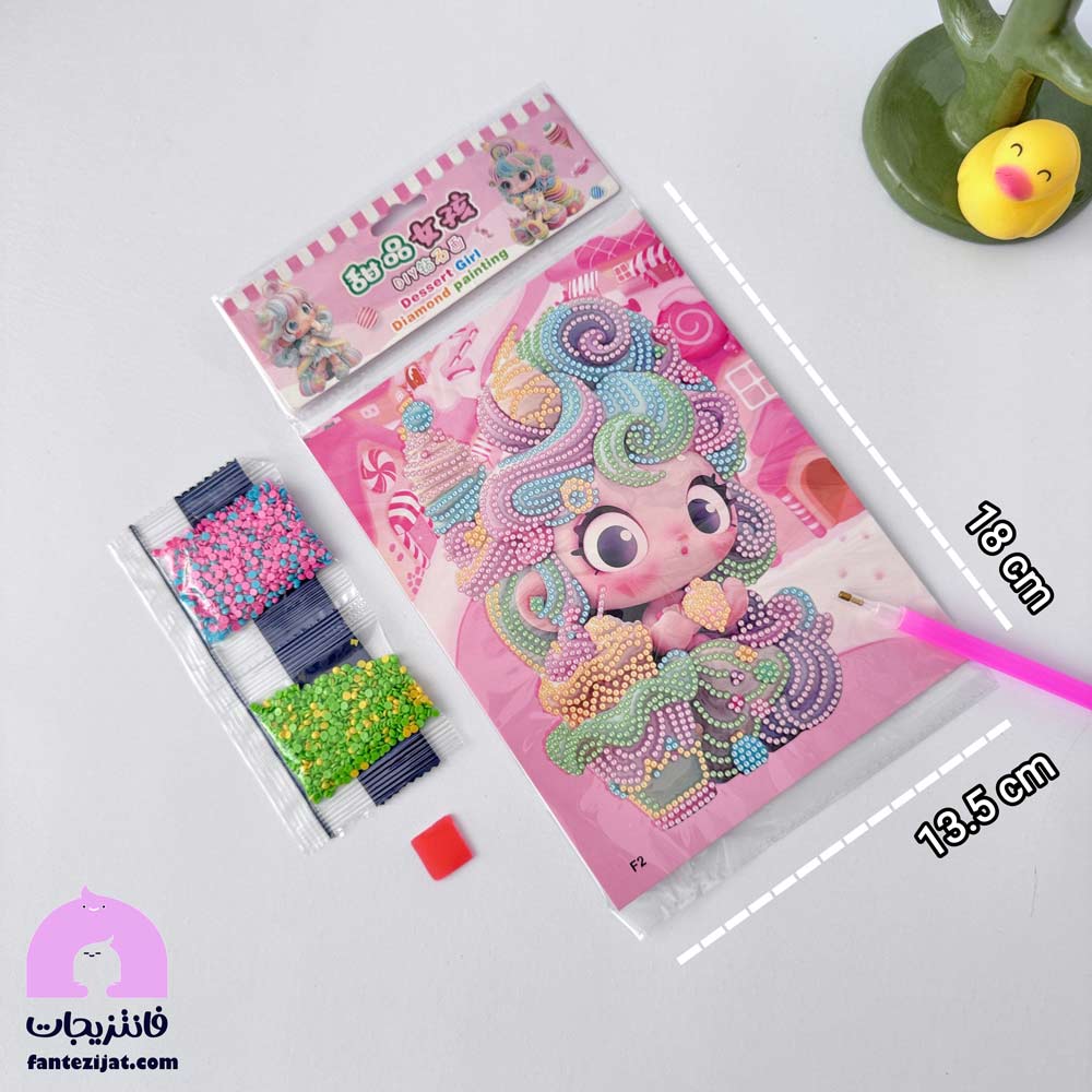 دارای یک عدد قلم، چسب مربعی کوچک، صفحه زمینه و الماس یا همان نگین ها.