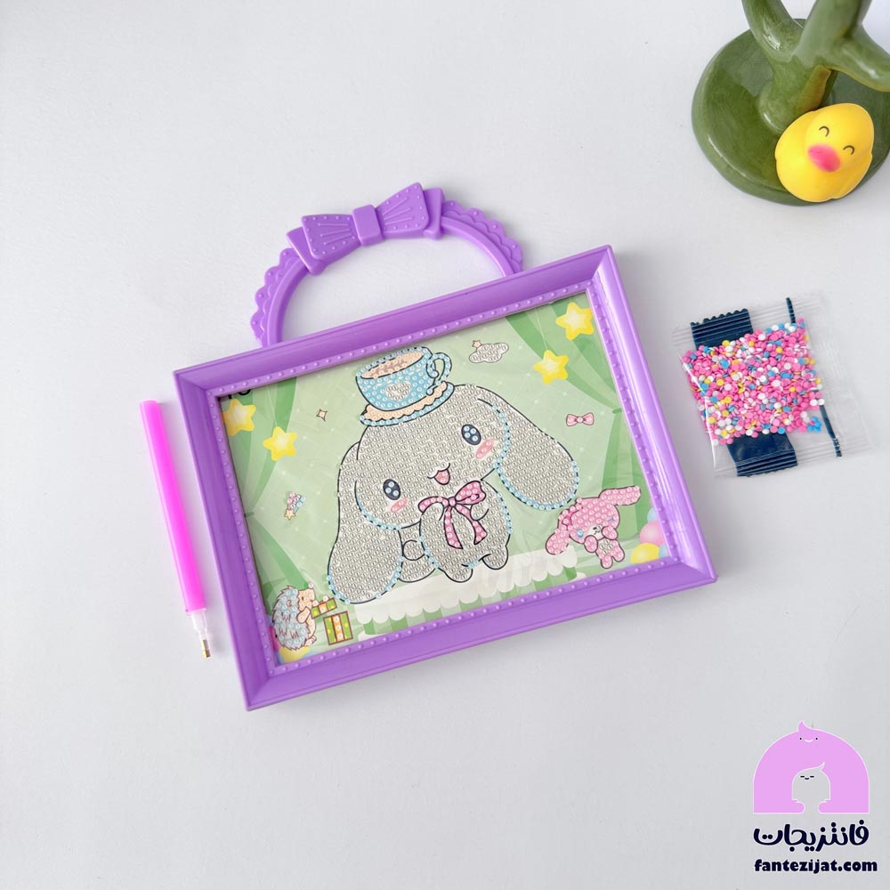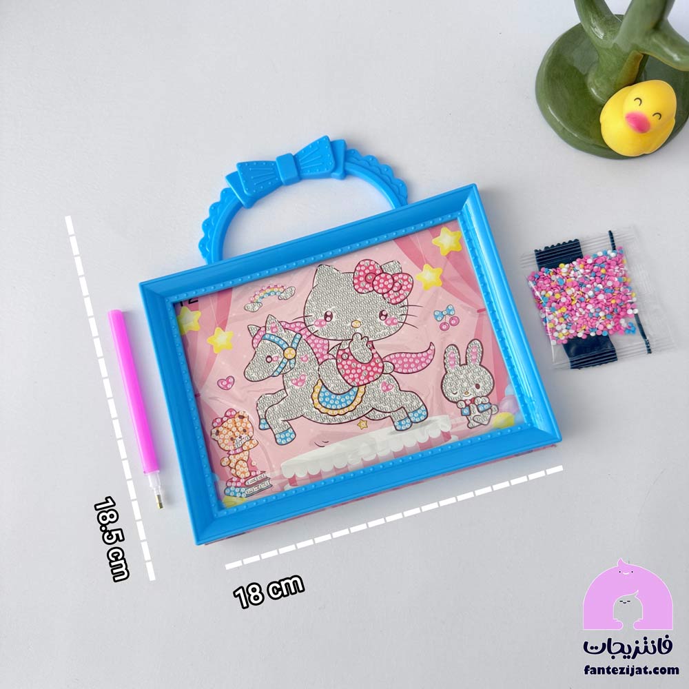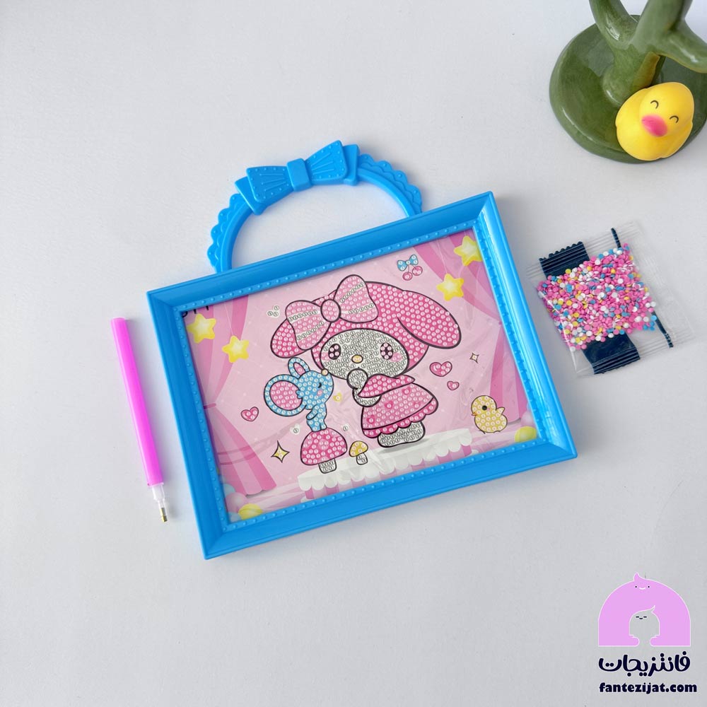 دارای یک عدد قلم، چسب مربعی کوچک، صفحه زمینه، قاب و الماس یا همان نگین ها.
