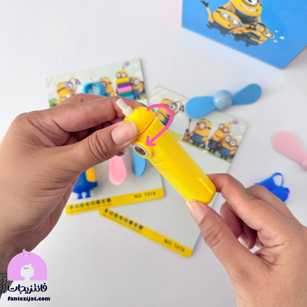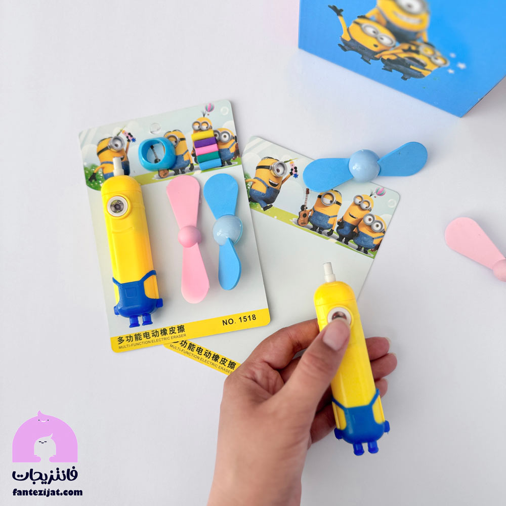 این پک حاوی بدنه دستگاه به شکل مینیون، دو عدد سری، تعدادی پاک کن یدک، دو عدد فن با جنس پلاستیک و جنس فوم می باشد.